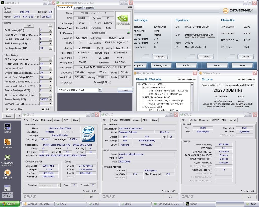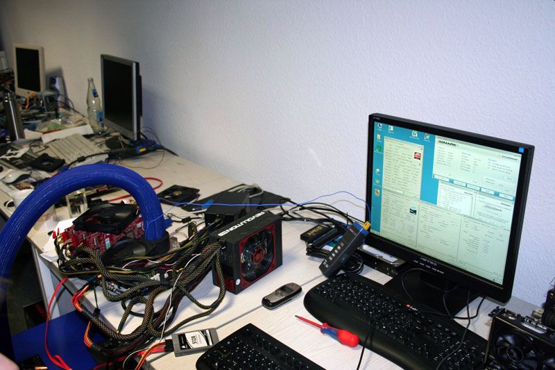 Freitag Abend, 19 Uhr. Treffpunkt Topas GBS Datentechnik in Cottbus. Zusammen mit Hoschi und masterchorch wollen wir eine kleine OC-Session abhalten, in der es primär darum gehen soll, gute Ergebnisse mit unserem Rampage Extreme, einem E8600 und einer GTX 295 einzufahren. Nebenbei wollen wir noch einen neuen Xeon W3540 testen, den Hoschi vor einigen Tagen bestellt hatte - und der unter seiner Wasserkühlung bereits erstaunliches Potenzial gezeigt hat. So konnte er Benchmarks mit Taktraten durchführen, die unsere beiden i7 965 XE kaum mit Kaskade erreichten. Es gab also viel zu tun.
