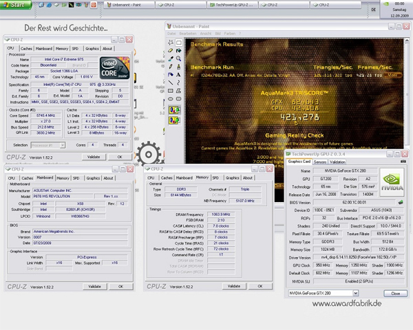 Gegen 16:30 trudelten dann stummerwinter und masterchorch ein: Es konnte endlich losgehen. Nach einer herzlichen Begrüßung wurde sofort damit begonnen, die verschiedenen Systeme zu präparieren. Zu diesem Zeitpunkt wusste noch niemand, was uns an diesem Abend oder vielleicht sogar in dieser Nacht erwartete. Wir wollten unseren 3DMark06-Weltrekord, welchen wir am 04.09.2009 mit Kaskadenkühlung aufstellen konnten, weiter verbessern. Stuwi hatte hauptsächlich vor, mit zwei GTX 280 im Aquamark die Bestmarke von AndreYang anzugreifen und zu schauen, was sein relativ neuer Core i7 975XE so alles kann.