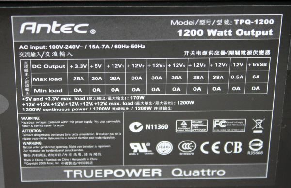 Hier haben wir die Leistungswerte auf einen Blick. Sagenhafte sechs 12 Volt-Leitungen stehen zur Verfügung, die jeweils bis zu 38 Ampere liefern können. In Summe können über diese sechs 12 Volt-Schienen bis zu 1200 Watt an Verbraucher abgegeben werden. Betrachtet man diese Daten, so fällt auf, dass Antec sehr konservativ zu Werke geht, wenn es um die Angabe der dauerhaften Last geht. Rechnerisch könnte das Netzteil noch deutlich mehr.