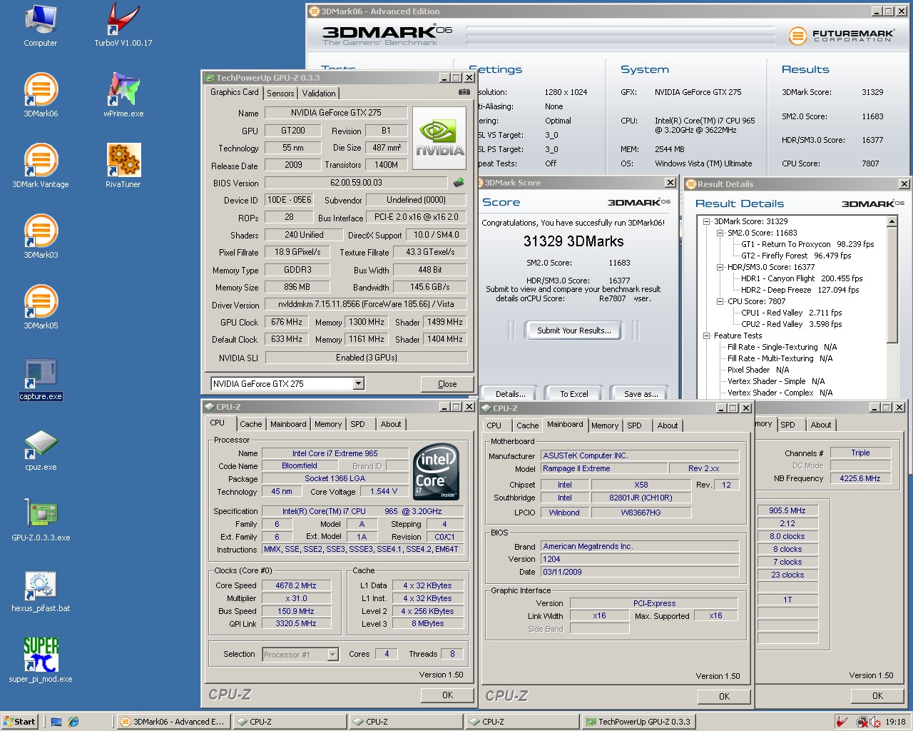 Ohne LN2 gab es für dieses System keine "Verwendung" mehr, weshalb wir abschalteten, abtauten und alles trockneten. Als nächstes warfen wir masterchorch einen Blick über die Schulter, der am 3DMark Vantage nahezu verzweifelte. Denn während der 3DMark06 mit knapp 4,7 GHz inklusive HT durchlief, gab es im Vantage generell beim Start des 1. CPU-Tests einen Freeze. Selbst ohne HT und mit stark reduzierter Taktrate auf 4.550 MHz wollte dieser Test nicht durchlaufen, weshalb er irgendwann kapitulierte und das System ebenfalls abschaltete. Allerdings konnte er (mit Ausnahme von Vantage) einige gute Scores mit NVIDIAs GTX 275 einfahren: