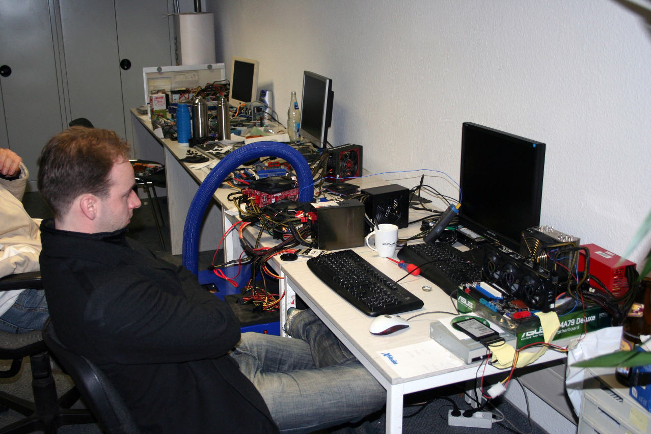 Freitag Abend, 19 Uhr. Treffpunkt Topas GBS Datentechnik in Cottbus. Zusammen mit Hoschi und masterchorch wollen wir eine kleine OC-Session abhalten, in der es primär darum gehen soll, gute Ergebnisse mit unserem Rampage Extreme, einem E8600 und einer GTX 295 einzufahren. Nebenbei wollen wir noch einen neuen Xeon W3540 testen, den Hoschi vor einigen Tagen bestellt hatte - und der unter seiner Wasserkühlung bereits erstaunliches Potenzial gezeigt hat. So konnte er Benchmarks mit Taktraten durchführen, die unsere beiden i7 965 XE kaum mit Kaskade erreichten. Es gab also viel zu tun.