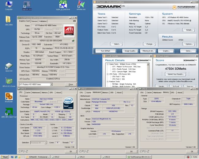 Der Prozessor wurde während der kompletten Nacht mit unserer Kaskade gekühlt. Die Kaskade kam deshalb zum Einsatz, weil sie zum Vortesten ideal geeignet ist. Die Temperatur bleibt konstant, man muss sich nicht darum kümmern und kann sich voll auf das System selbst konzentrieren - DER Vorteil gegenüber flüssigem Stickstoff. Außerdem galt es herauszufinden, wie sowohl der Prozessor als auch auf das Mainboard auf Kälte reagieren - schließlich hatten wir das Rampage II Extreme noch nie mit einem hohen BCLK unter Kaskade genutzt. Als alles lief stellten wir fest , dass wir problemlos bis knapp unter 5,1 GHz arbeiten konnten. Die meiste Zeit sah das dann so aus: