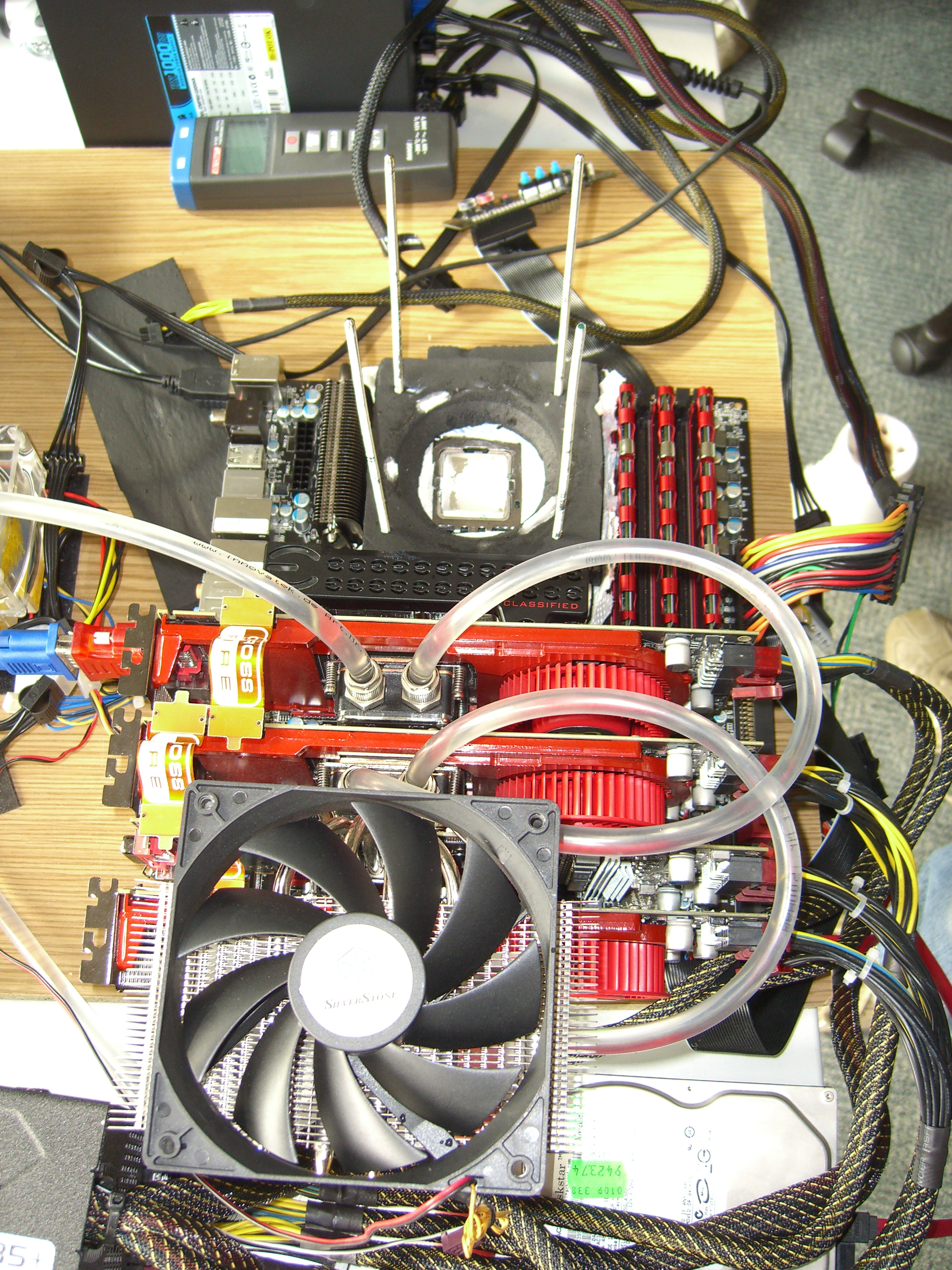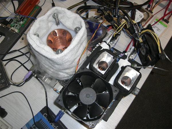 Gegen 16:30 trudelten dann stummerwinter und masterchorch ein: Es konnte endlich losgehen. Nach einer herzlichen Begrüßung wurde sofort damit begonnen, die verschiedenen Systeme zu präparieren. Zu diesem Zeitpunkt wusste noch niemand, was uns an diesem Abend oder vielleicht sogar in dieser Nacht erwartete. Wir wollten unseren 3DMark06-Weltrekord, welchen wir am 04.09.2009 mit Kaskadenkühlung aufstellen konnten, weiter verbessern. Stuwi hatte hauptsächlich vor, mit zwei GTX 280 im Aquamark die Bestmarke von AndreYang anzugreifen und zu schauen, was sein relativ neuer Core i7 975XE so alles kann.